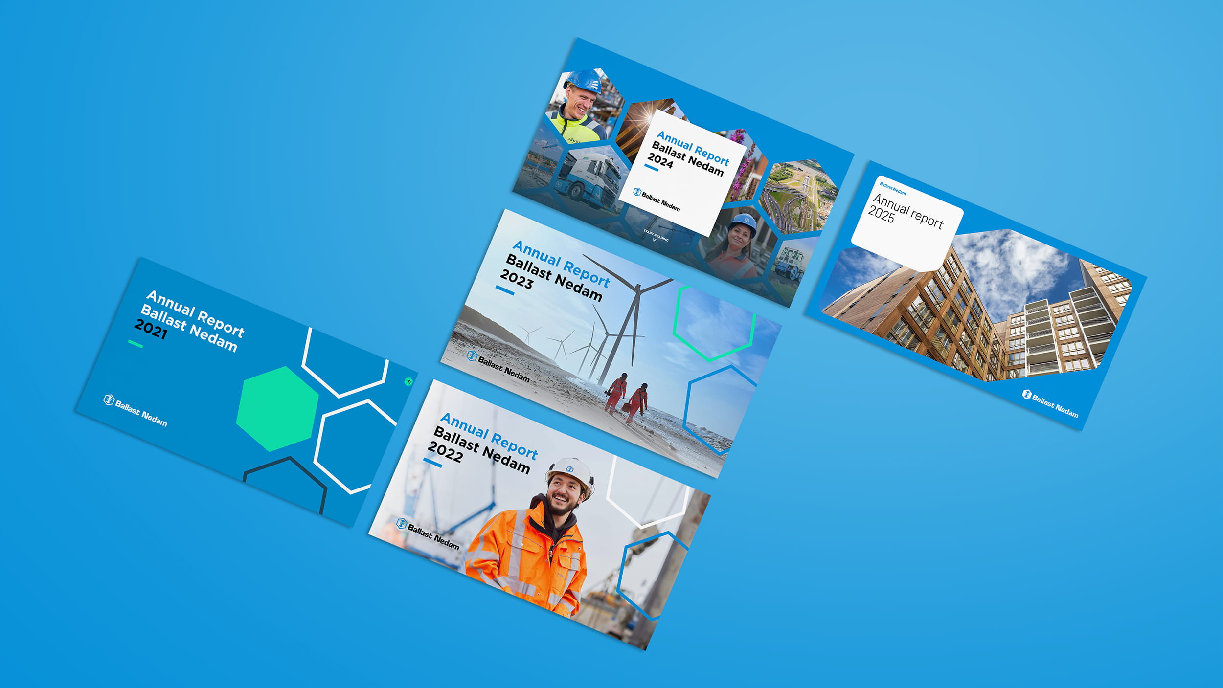 Een jaarverslag is een moment van reflectie, maar ook een kans om te laten zien wie je bent als organisatie. Ballast Nedam zocht naar een toegankelijke manier om haar omvangrijke jaarverslag te delen met collega’s, partners en andere belanghebbenden. We vertaalden de nieuwe huisstijl naar een fris ontwerp voor een klikbaar jaarverslag. Het resultaat is een overzichtelijk document met fotografie, portretten en visuele accenten die de inhoud versterken. Inmiddels werken we al vijf jaar op rij aan het jaarverslag, met ieder jaar een gerichte doorontwikkeling die aansluit bij de thema’s en ontwikkelingen van dat jaar.