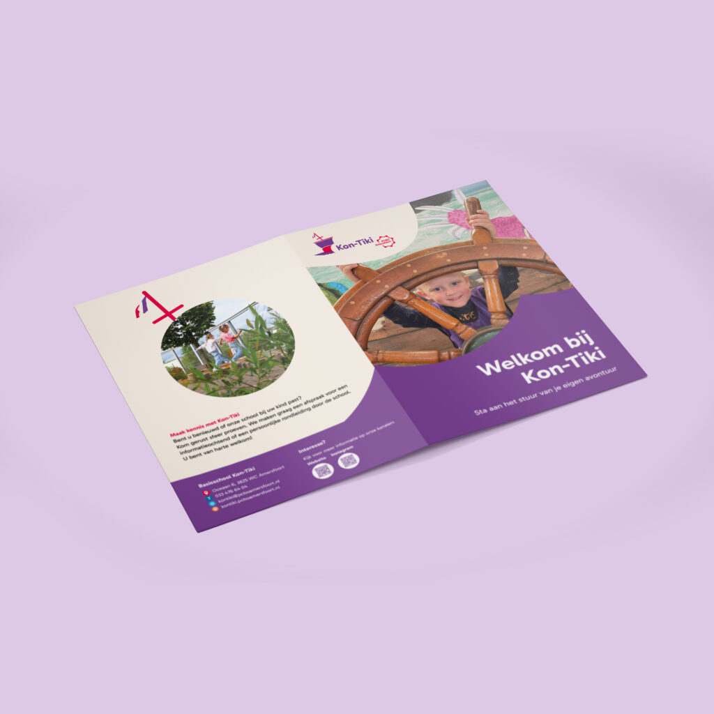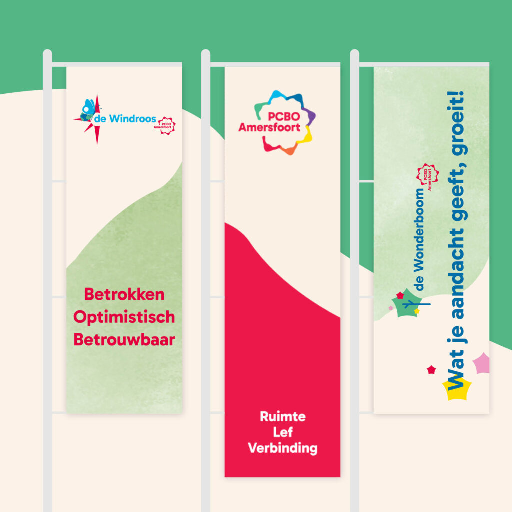 Om zowel het verhaal van de stichting als het unieke karakter van iedere school zichtbaar te maken, verfristen we de huisstijl met een nieuw logo voor de stichting en de iedere school, een aangescherpt kleurenpalet en een huisstijlhandboek. Ook vertaalden we dit naar uiteenlopende middelen zoals schoolgidsen, een jaarplan, visuele koersplannen, vlaggen, banners en flyers. Zo ontstond een visuele lijn waarin elke school haar eigen gezicht behoudt, terwijl alles samen één helder en consistent verhaal vertelt.